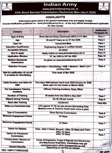 The Indian Army has announced the recruitment process for the Short Service Commission (SSC) Technical April 2026 Batch Army SSC Technical Men 67th Online Form 2026. This prestigious opportunity is open to eligible unmarried Male engineering graduates, as well as widows of Indian Armed Forces personnel, to join the armed forces and serve the nation.