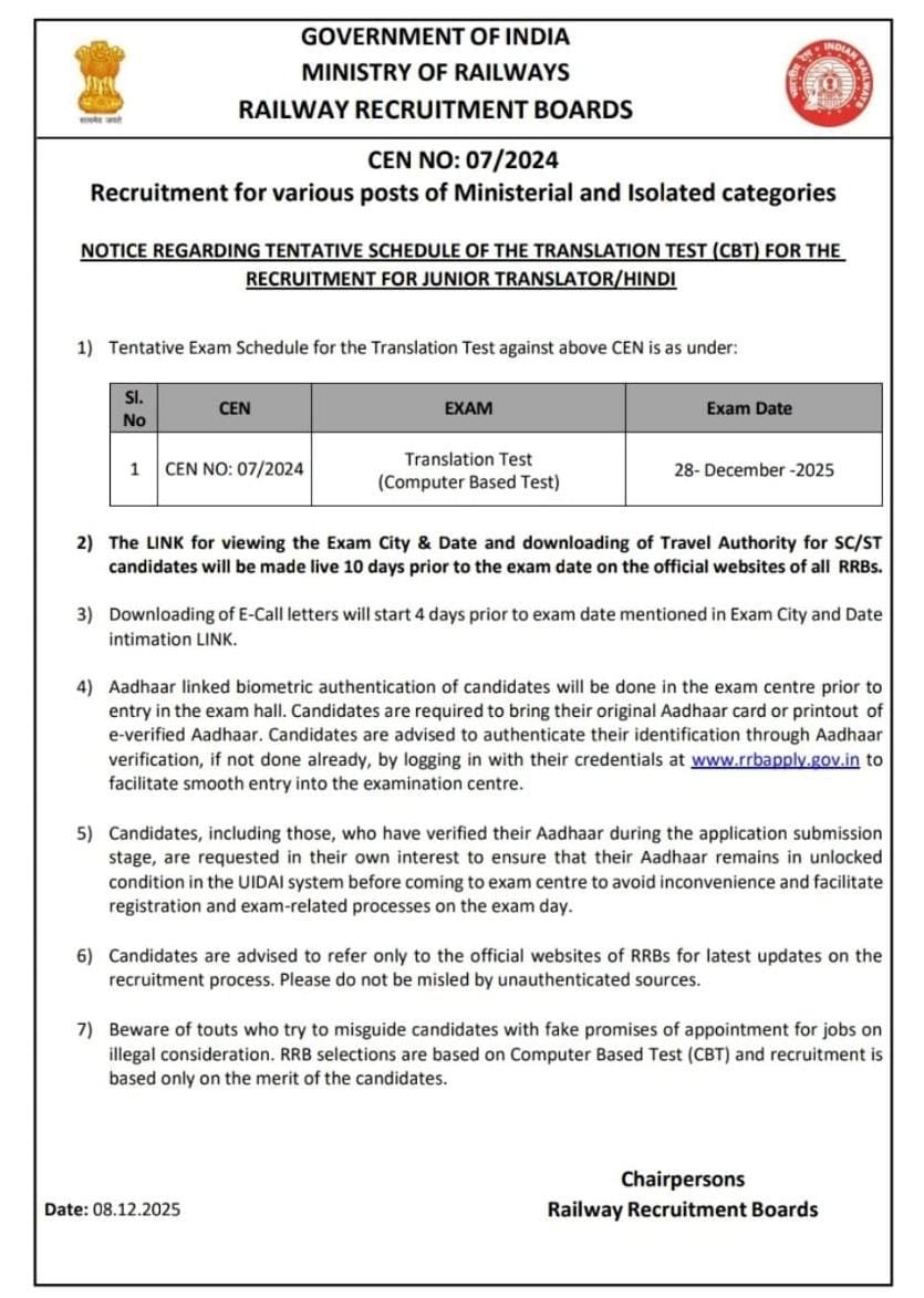 | RRB Ministerial and Isolated Post Exam Date | 10 to 12 September 2025 |