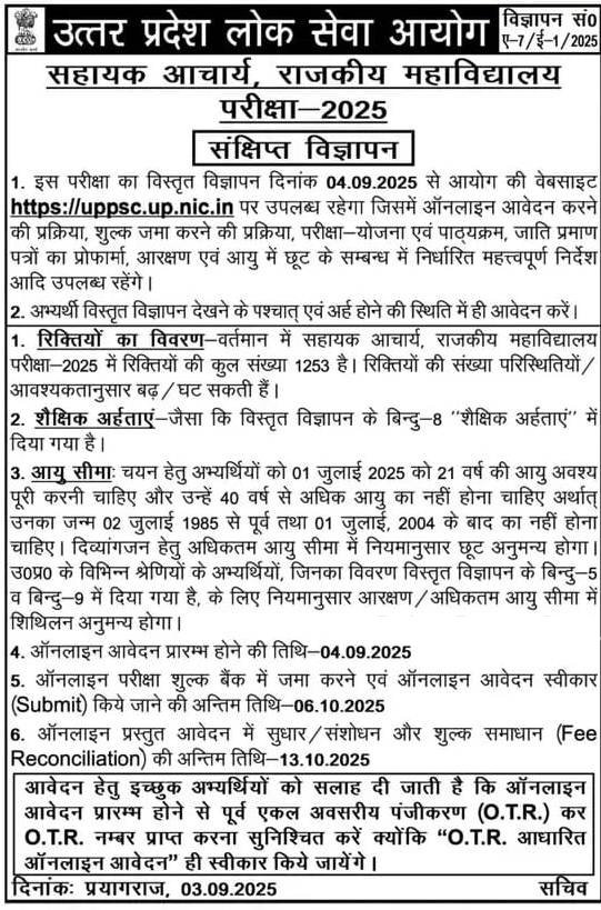 This is a short detail of the UPPSC Assistant Professor Vacancy 2025. For complete information, see the official Notification and then fill out your application form.