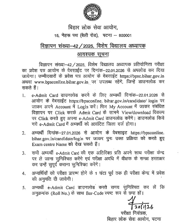 | BPSC Special School Teacher Admit Card Available | 22 January 2026 |