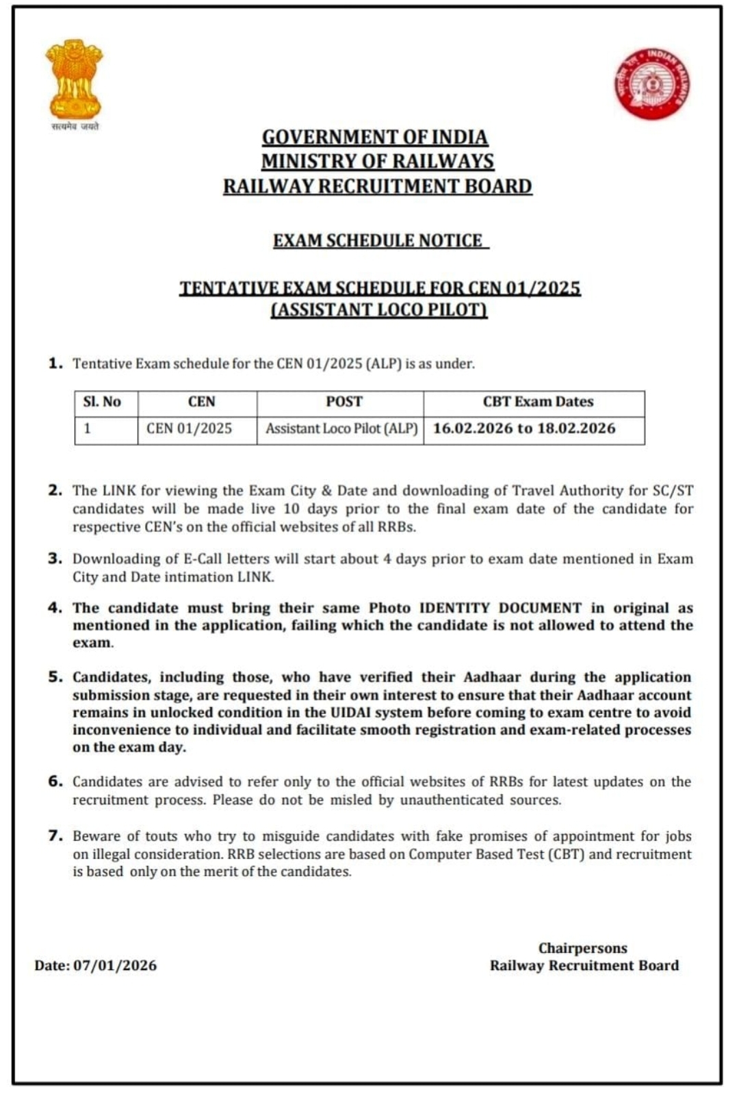 - RRB ALP CBT 1 Exam Date: 16 to 18 February 2026