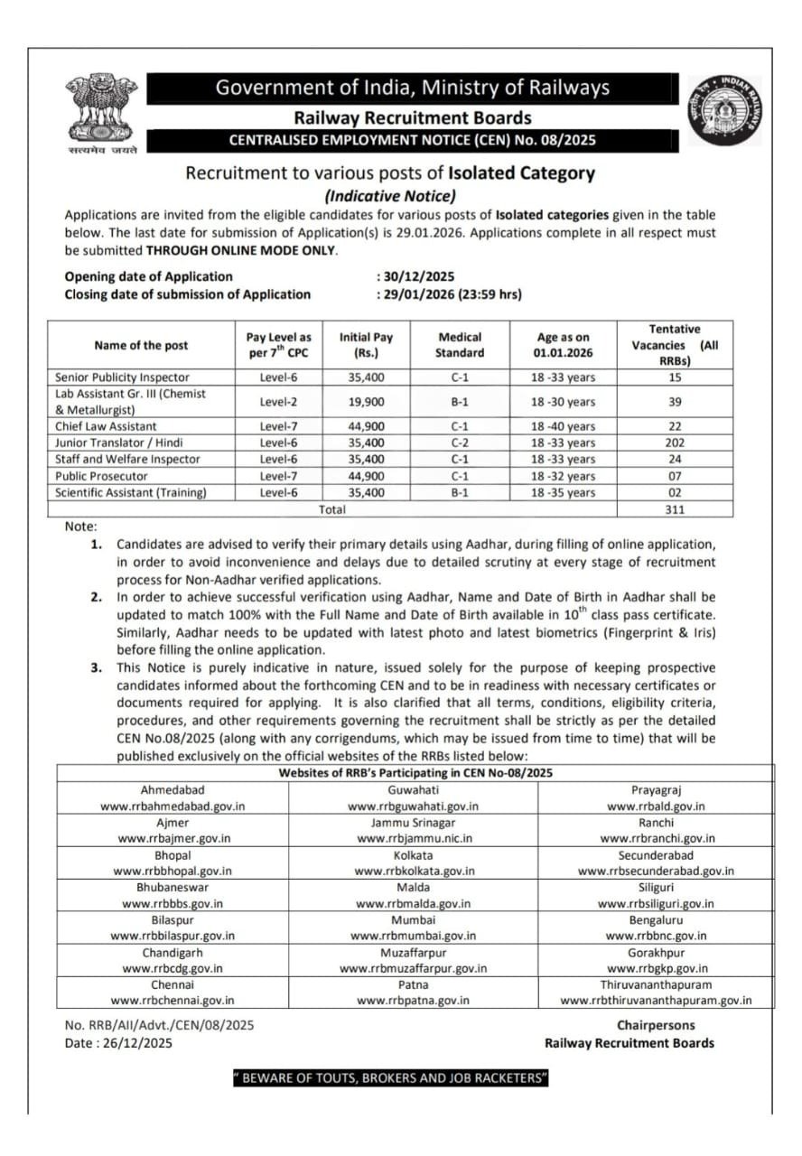 This is a short detail Railway RRB Isolated Vacancy 2025, for complete information see the official Notification and then fill up your application form.