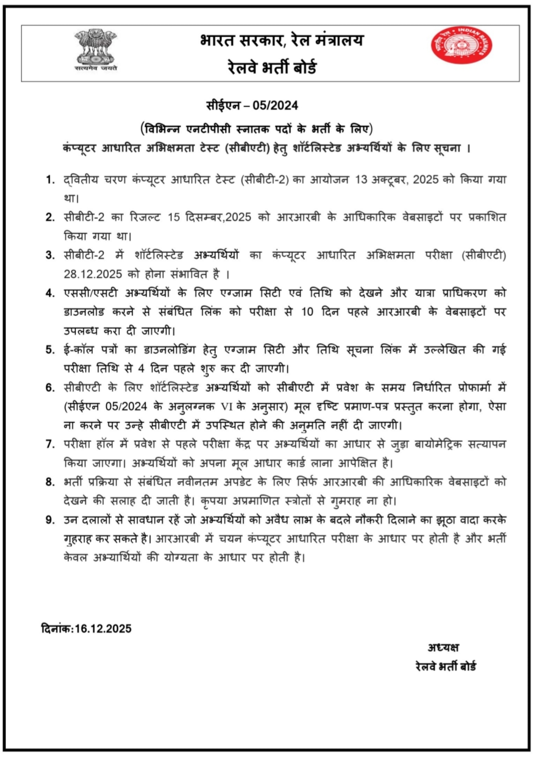 | RRB NTPC Graduate Level CBAT Exam date | 28 December 2025 |