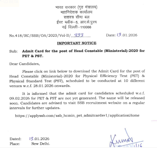 SSB Head Constable Ministerial PET/PST Admit Card 2026